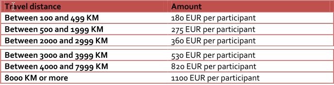 Considering the new Erasmus+ Guide the participants get a round sum of money, according to the distance (in km) between their home and place of the project. Please see the table below (color - red).